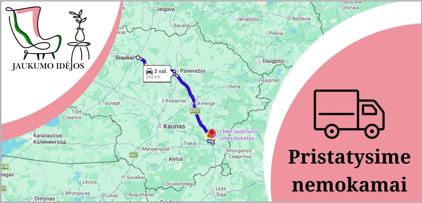• NEMOKAMAS PRISTATYMAS VISOJE LIETUVOJE IŠSKYRUS KURŠIŲ NERIJĄ. Pristatysime baldus iki Jūsų namo (tos vietos kur gali privažiuoti krovininis mikro autobusas). Toliau baldų įnešimu, užnešimu į savo namus turi pasirūpinti pats klientas, todėl prieš perkant įsivertinkite ar turėsite tam visas galimybes. Jūsų užsakymą stengsimės pristatyti Jums patogiu laiku. Užsakymo pristatymo dieną, prekes pristatantis darbuotojas susisieks su klientu ir informuos apie savo atvykimą.