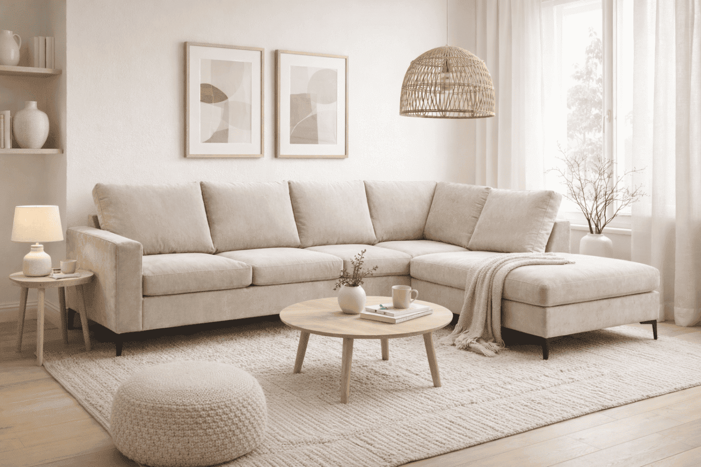 Užsisakykite skandinaviško stiliaus kampinę sofą internetu ir kurkite jaukius, harmoningus namus su Jaukumo idėjos.
