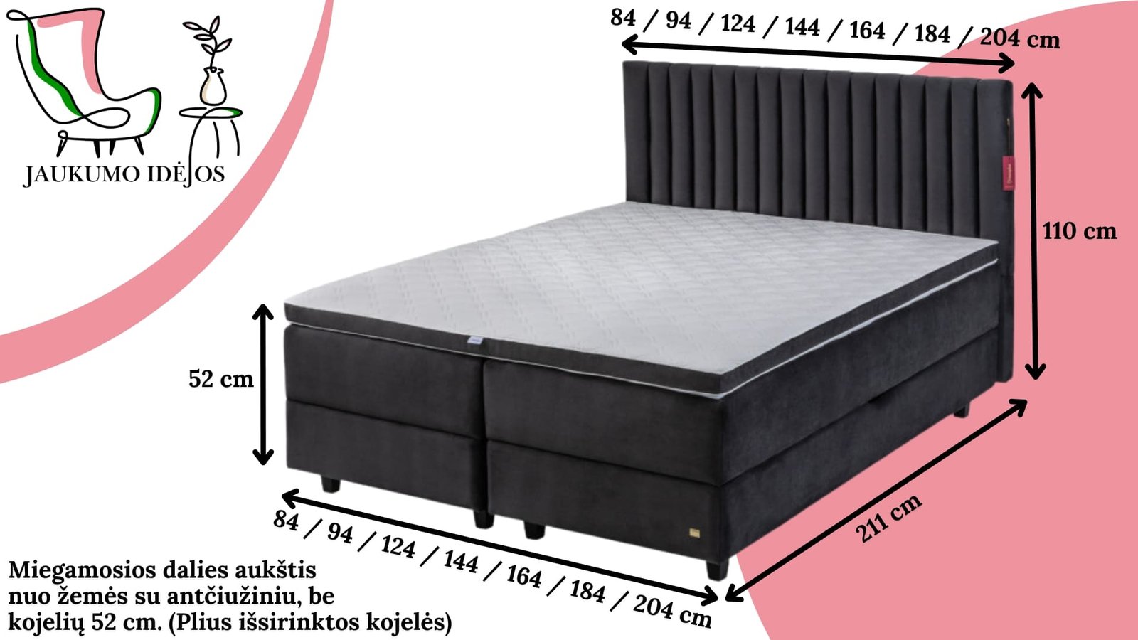 - Lovos ilgis 211 cm (Atitinkamai kai lovos ilgis 180 cm pagal čiužinio dydį visa lova bus 191 cm ilgio ir taip pat kai lovos ilgis 220 cm pagal čiužinio dydį visa lova bus 231 cm ilgio).