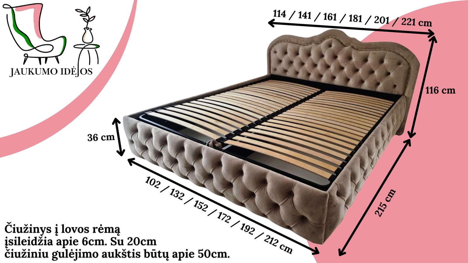 • Kadangi lovos konstrukcija apklijuojama porolonu ir kitomis minkštomis medžiagomis, todėl visi lovos matmenys gali šiek tiek kisti.