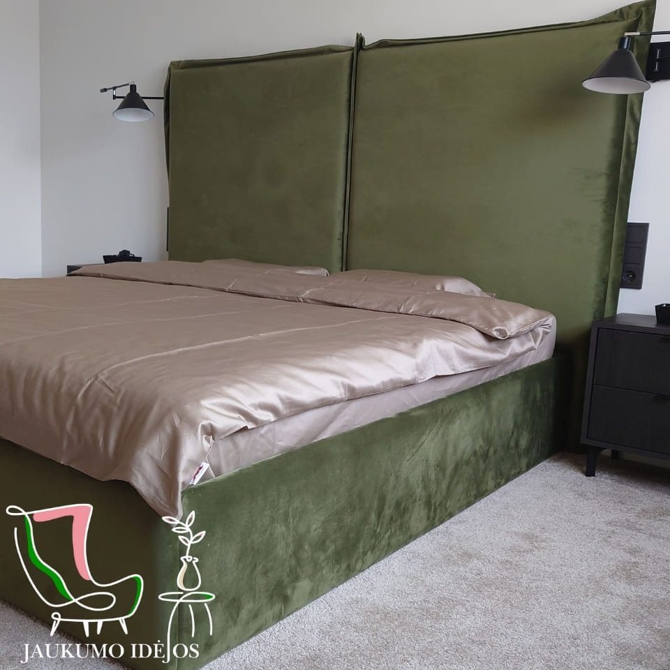 - Lovos konstrukcija padaryta taip, kad lovos galvūgalis būtų statomas, remiamas prie sienos, todėl nugarinė galvūgalio pusė aptraukiama baldine technine medžiaga, už papildomą mokesti galime aptraukti galvūgalio nugarinę pusę tuo pačiu išsirinktu audiniu bei pakalti dekoratyvinėmis vinutėmis.