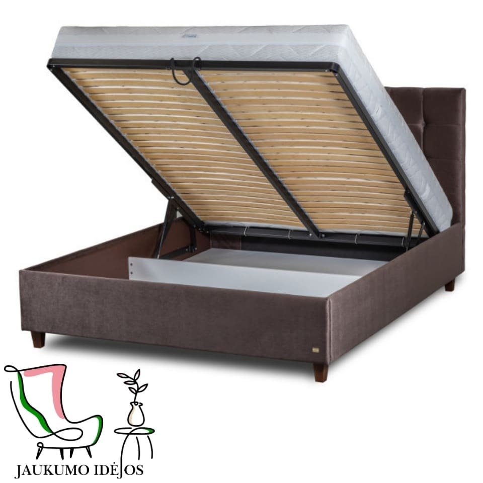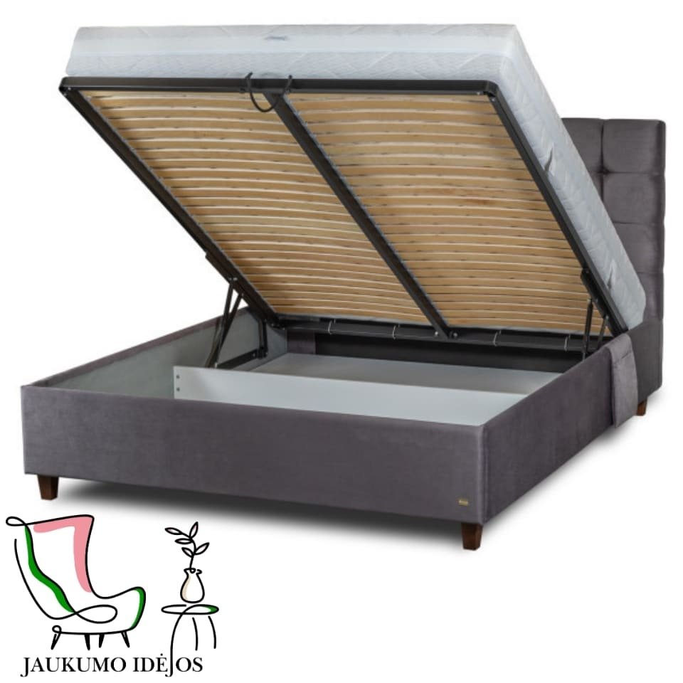 - Patogus čiužinio pakėlimo mechanizmas iš lovos galo leis patogiai pasiekti visą dėžės turinį. Įmontuotas pakėlimo mechanizmas leis pakelti čiužinį kartu su tvirtu metaliniu rėmu ir įmontuotomis grotelėmis.
