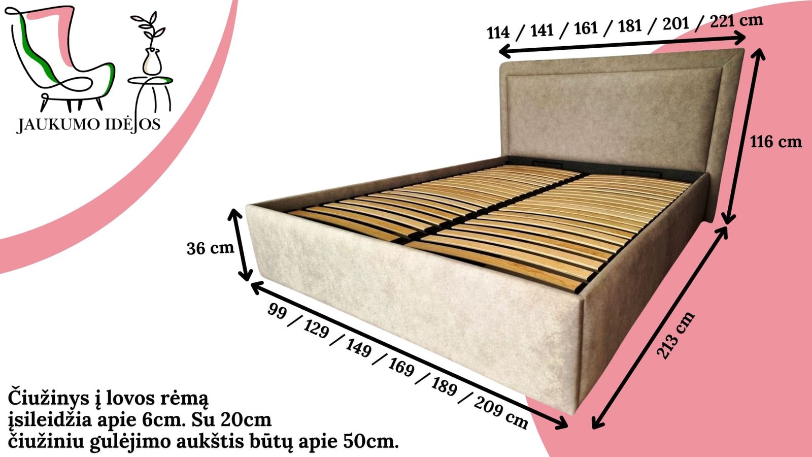 - Kadangi lovos konstrukcija apklijuojama porolonu ir kitomis minkštomis medžiagomis, todėl visi lovos matmenys gali šiek tiek kisti.