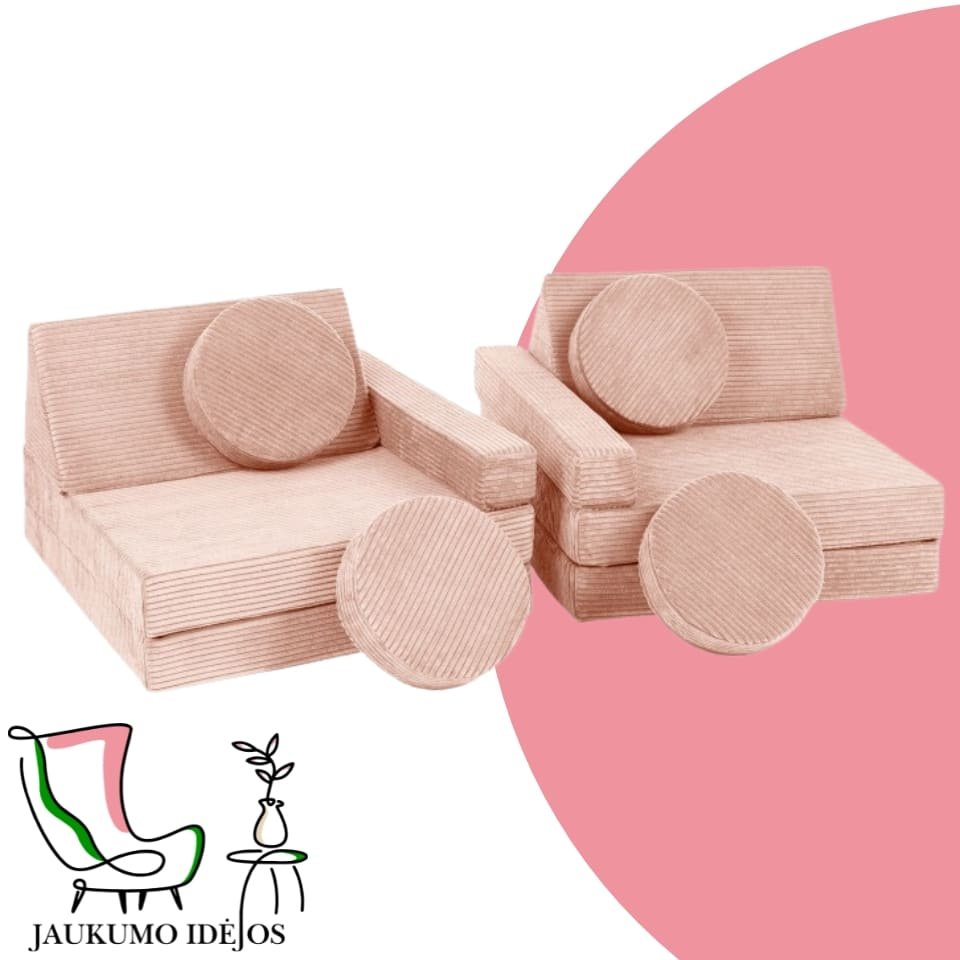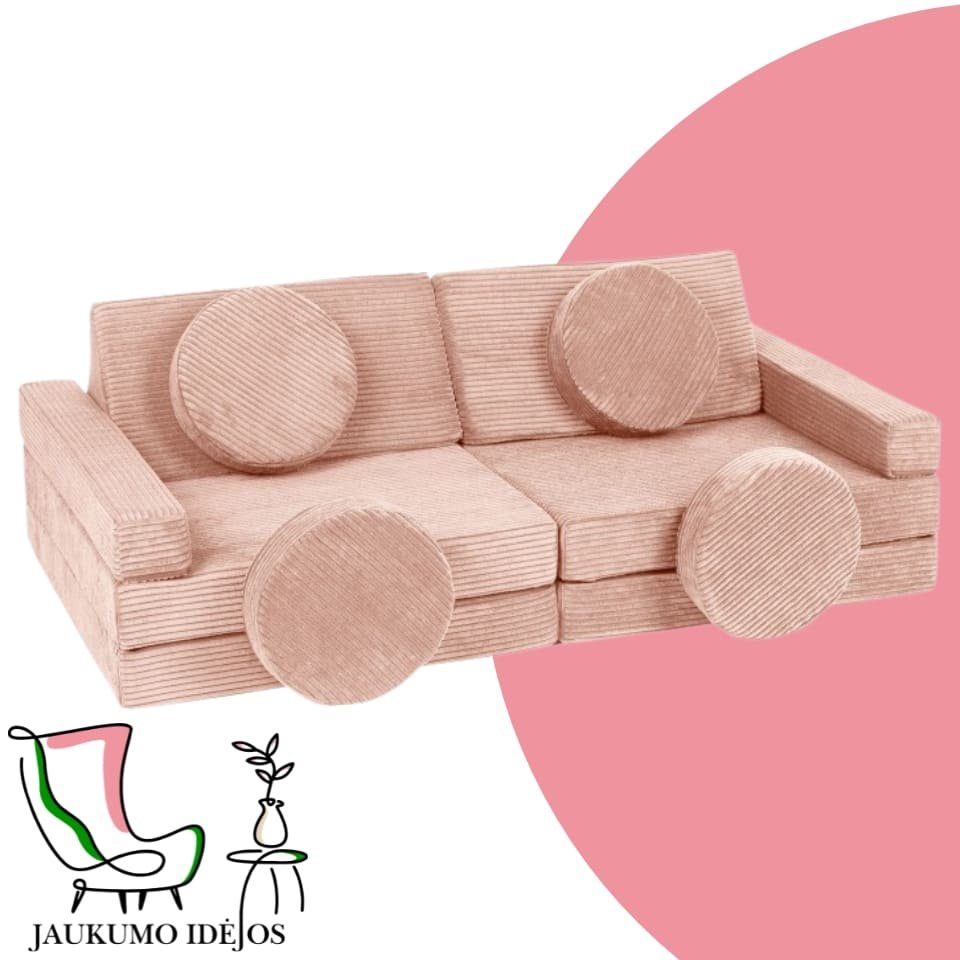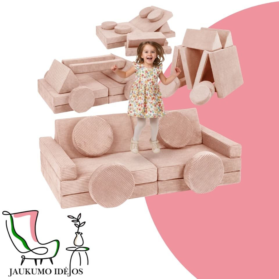 Šios modulinės sofos vaikams išsiskiria savo universalumu – atskiri minkšti moduliai gali būti lengvai perstatomi, todėl vaikai gali patys kurti savo erdves: nuo jaukios skaitymo vietos iki smagių žaidimų fortų. Būtent tokios jaukumo idėjos padeda ugdyti vaiko fantaziją ir savarankiškumą.