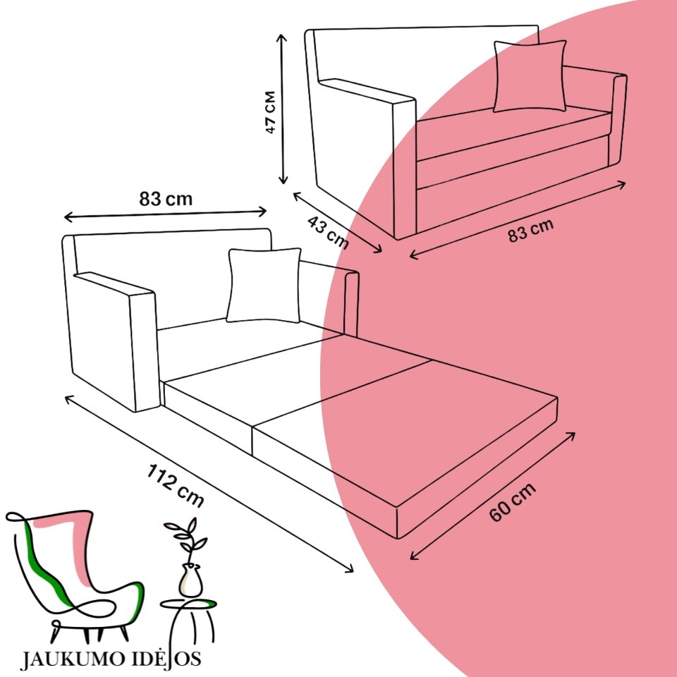 • Nuimamas užvalkalas– sofa turi lengvai nuimamą, skalbiamą užvalkalą.